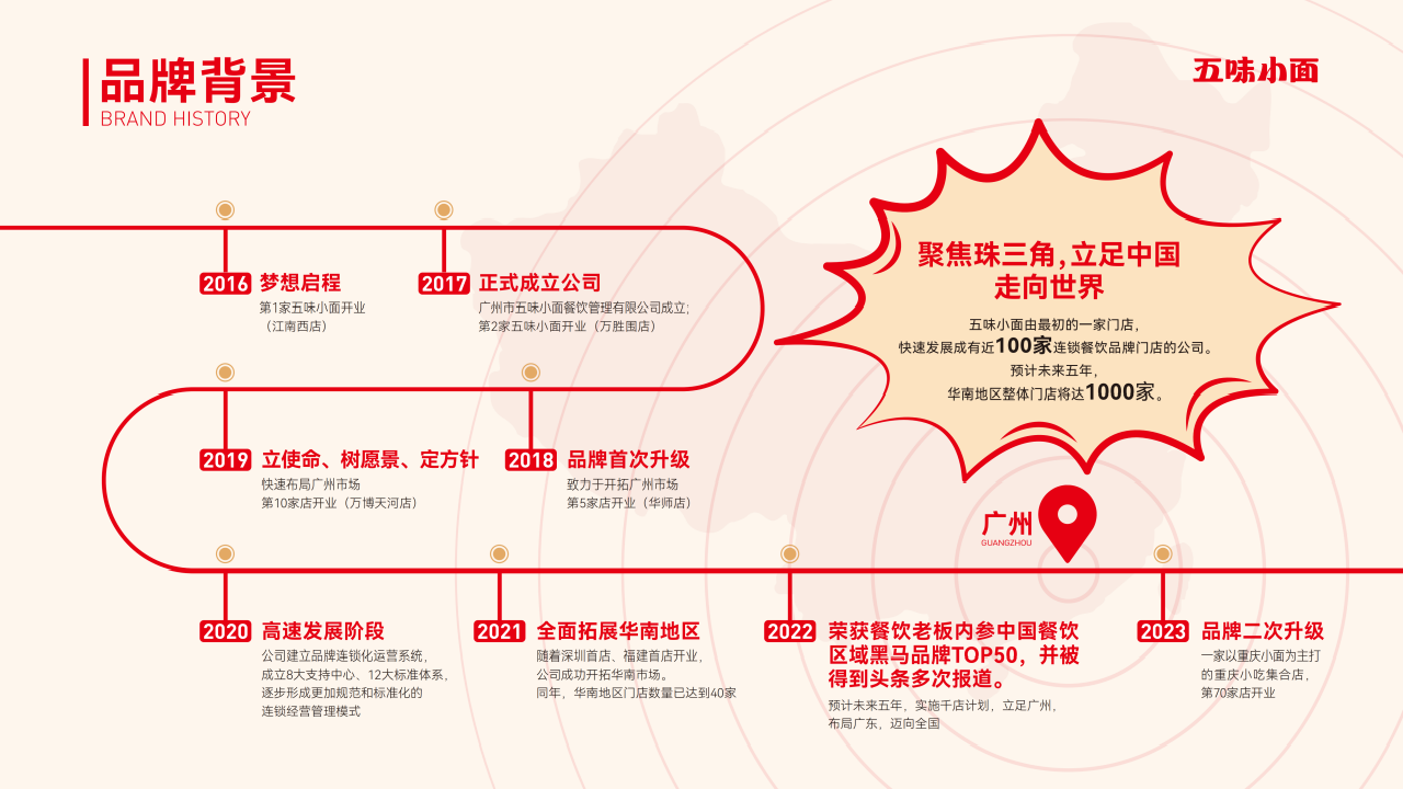 五味小面創立于2016年,2019年開始公司化運營,2020年開始以每年2-3倍增速逆勢發展。2023年,五味小面迎來3.0版本,我們將品牌戰略聚焦在“重慶招牌”上,并將重慶特有的“鮮、香、麻、辣、爽”注入品牌核心價值。我們立志做重慶小面的行業領導者,目前我們已在廣州、深圳、佛山、惠州、珠海、西安.上海等7個城市入駐,擁有70多家門店。